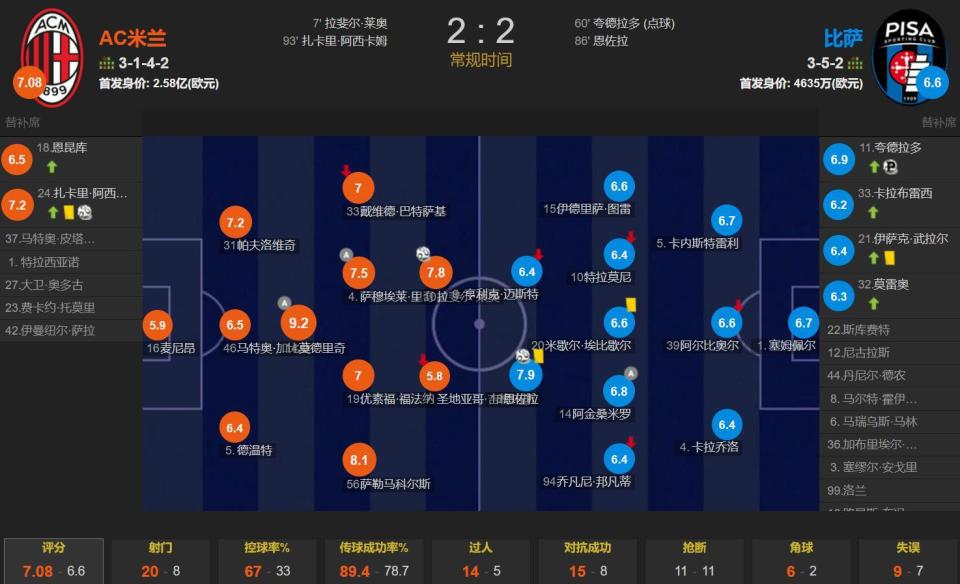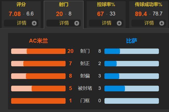 全场比赛,AC米兰的控球率为67%,一共有20次射门,其中7次射正;比萨一共有8次射门,其中2次射正。